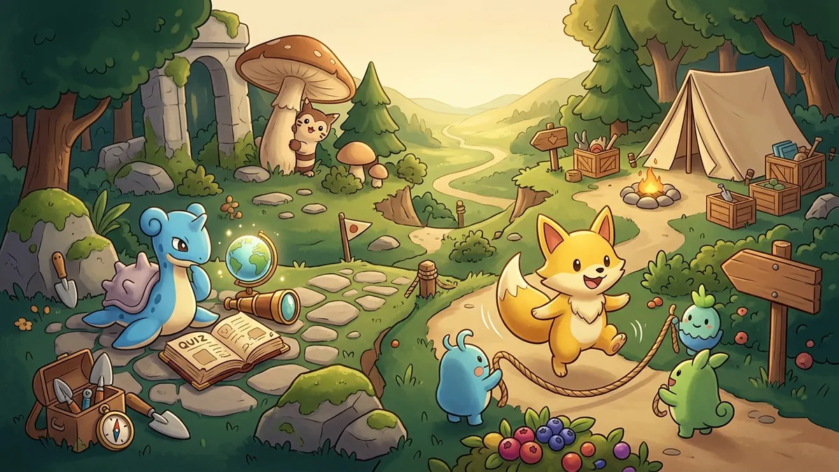 - Quizzes — El Pokemon te hace preguntas de trivia sobre el mundo. Las respuestas vienen de descripciones de objetos y diálogos de NPCs, así que pon atención a lo que lees.